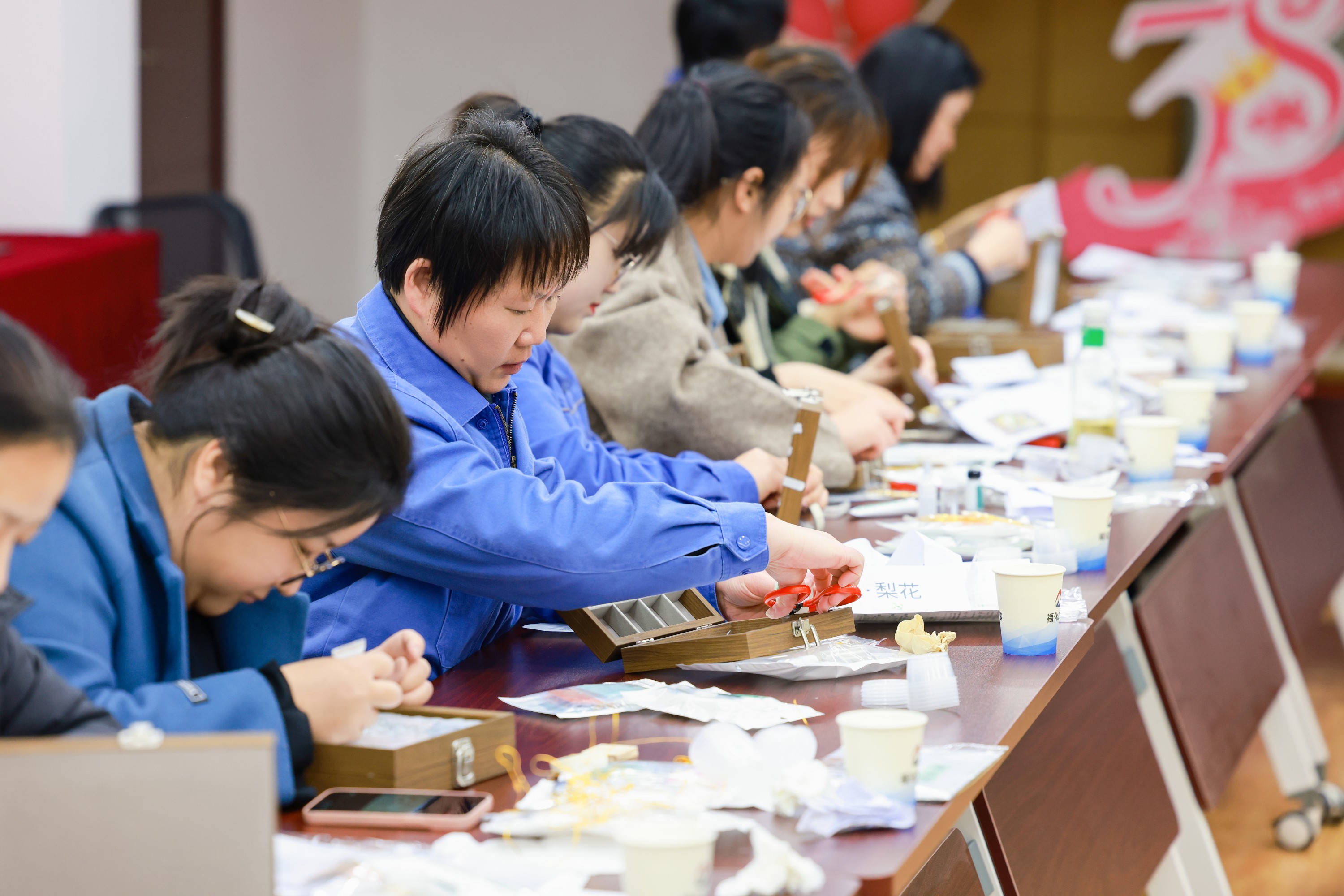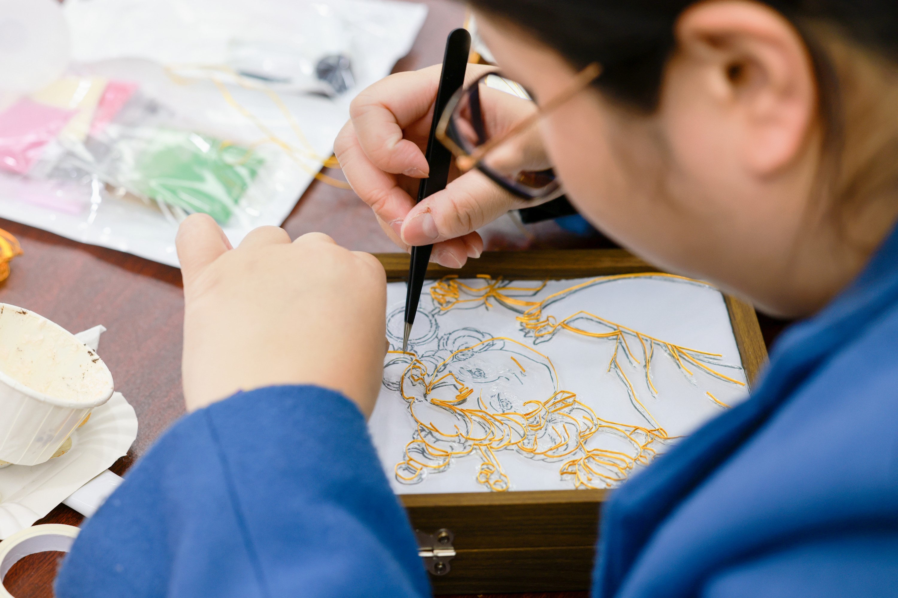 在掐丝珐琅首饰盒制作环节,女职工们化身匠人,执金丝为笔,运釉料成画,时而屏息凝神精雕细琢,时而喜笑颜开交流分享,使得原本静默的古老技艺,在交织的笑语中鲜活起来。