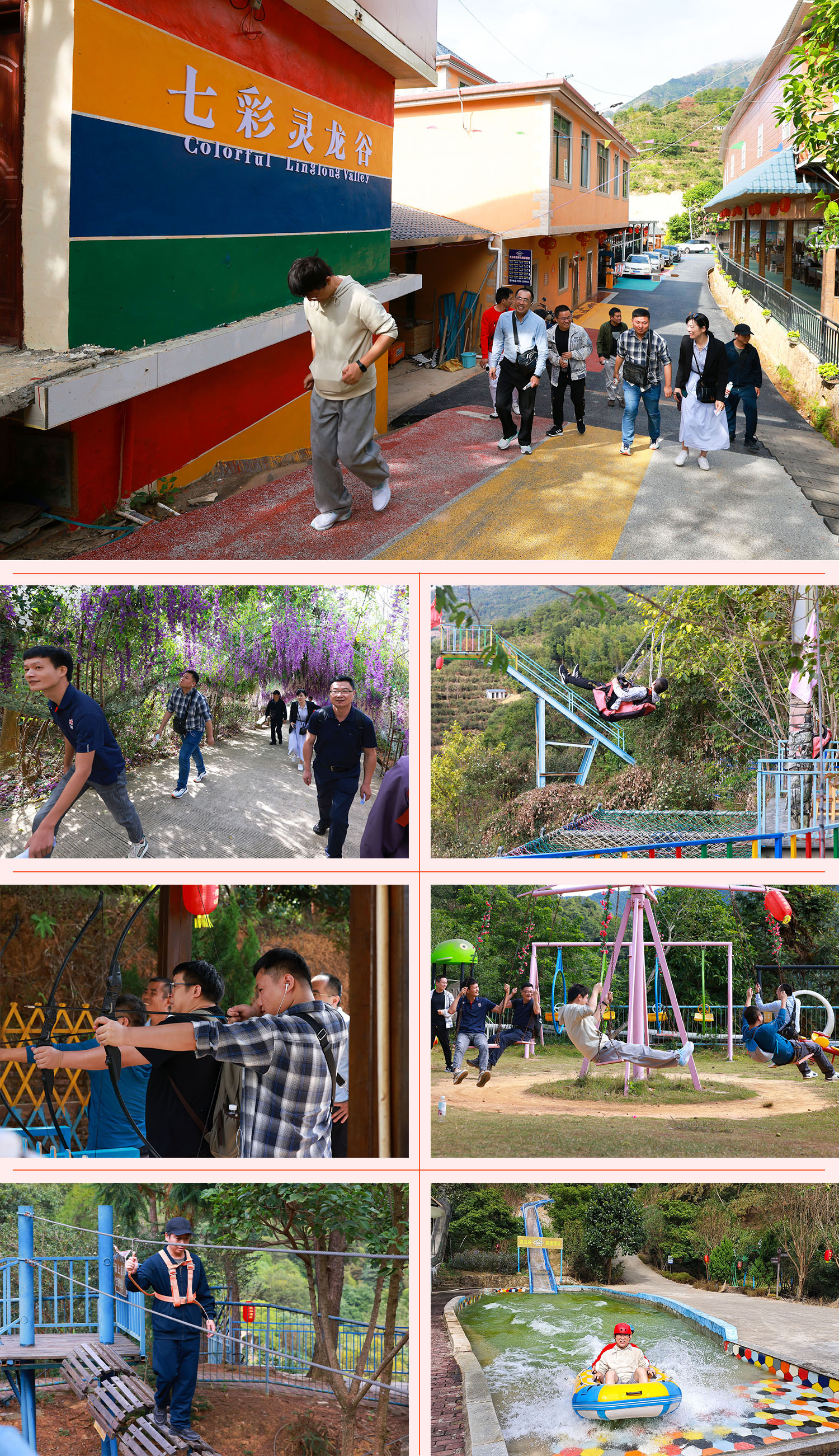 首站灵龙谷,位于高山原始森林中,是一个海拔500多米的幽深又原始的山谷。职工们沉浸在漫山遍野的绿意中,一呼一吸间畅享着大自然的气息,一松一弛间感受着游玩的欢乐与刺激。
